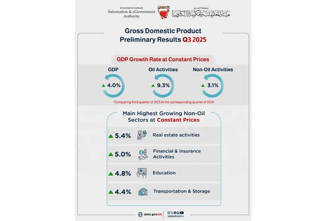 Bahrain has recorded real economic growth of 4% at constant prices and 4.5% at current prices during the third quarter of 2025 on an annual ...